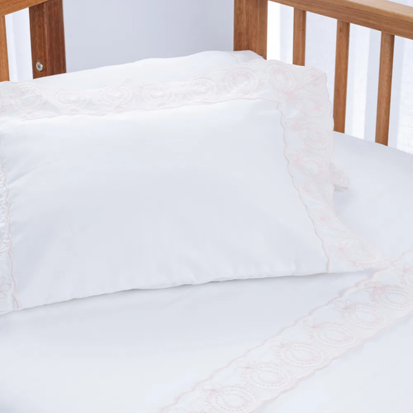 O bordado refinado de flores entrelaçadas por um laço simboliza o amor e o cuidado em preparar o primeiro ninho do seu pequeno.