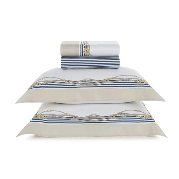 O Jogo de Cama Galizzi traduz a atmosfera náutica e atemporal de La Cala di Palermo em uma estampa exclusiva desenhada à mão, que traz cordas trançadas, listras suaves e formas que remetem ao ritmo sereno das embarcações ancoradas na marina italiana.