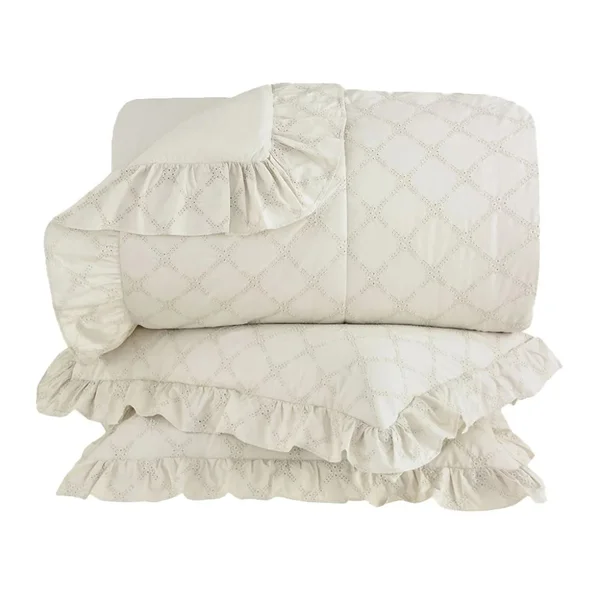 As laterais com babados vintage emolduram a colcha com charme e feminilidade, trazendo movimento e um acabamento rico em detalhes — perfeito para quem valoriza um quarto elegante e cheio de personalidade.